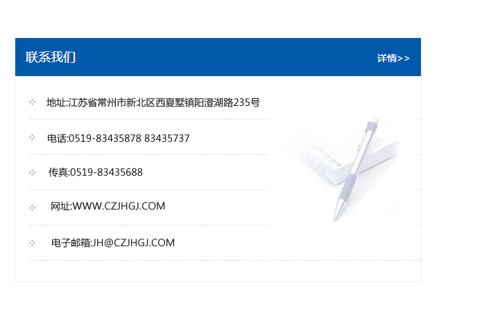 傳真:0519-83435688    郵編:213135    網(wǎng)址:WWW.czjhgj_com.xayami.com    電子郵箱:JH@czjhgj_com.xayami.com